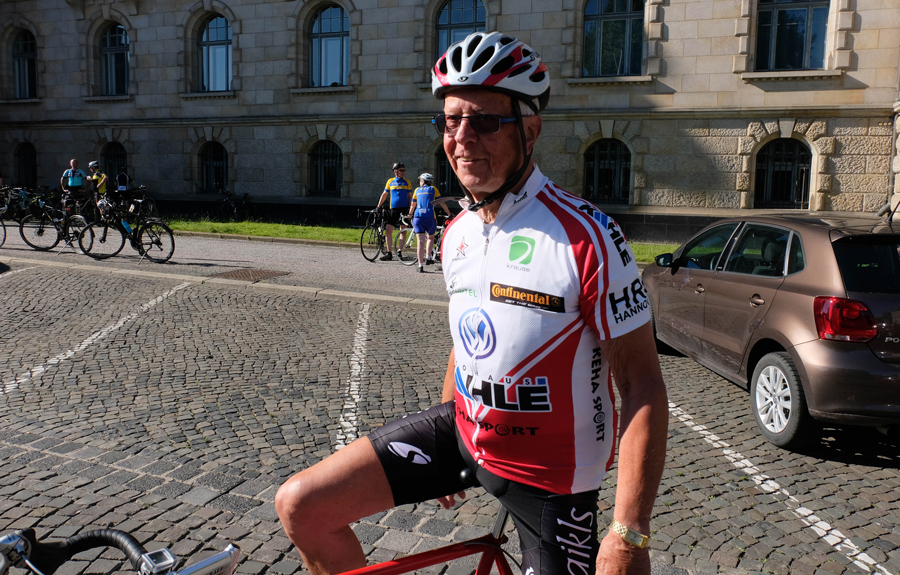 Zwischen dem Radsport und dem Schachsport gibt es viele Parallelen. Eine der wichtigsten Parallelen ist die, dass sich beide Sportarten ohne großen Leistungsverlust auch im fortgeschrittenen Alter ausüben lassen. Im Radsport ist Reinhard Kramer (siehe oben) dafür das Paradebeispiel. Reinhard ist mittlerweile 81 Jahre alt, was ihn nicht davon abhält, die heutige Tour mitzufahren. Stolz erzählte er mir vor dem Start, dass er in diesem Jahr bereits 1.500 km gefahren sei. Früher lag sein Fokus im Organisieren von Radsportveranstaltungen. Dafür wurde er mit dem Bundesverdienstkreuz 1. Klasse ausgezeichnet. Aus der Organisation großer Veranstaltungen, wie z.B. der Nacht von Hannover, konnte er sich trotz anderer Absichtserklärungen noch nicht ganz zurückziehen. Es mangelt nach seinen Worten an bereitwilligen Machern. Womit eine weitere Parallele zum Schachsport genannt sei. Mehr über Reinhard Kramer erfahrt ihr hier: